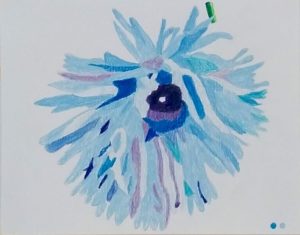 Après cette vue d’ensemble, elle nous conduit vers un lieu hautement symbolique de la vie de Proust : la chambre. Dans celle d’« Albertine », le rose domine. Un dahlia échevelé et une rose magnifiquement éclose jaillissent d’un feuillage caeruleum, indigo et pétrole. « Le temps retrouvé » dispose de deux chambres – l’une blanche, l’autre bleue – tout comme « La prisonnière » qui s’échappe de la violette et s’enferme dans la grise.