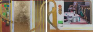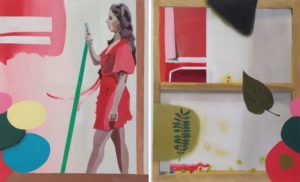 Erigée par l’artiste en Bible laïque de la création, La Recherche du Temps Perdu lui inspire aussi tout un ensemble de retables. Habituellement situés à l’arrière des autels, ils sont ici placés en retrait de l’œuvre, et mettent en scène des femmes, habillées dans la couleur dominante du tableau, entourées d’objets, de végétaux, d’émojis, de lignes et d’aplats décoratifs, pour créer un monde harmonieux trouvant son équilibre dans la diversité des éléments. On éprouve une grande sérénité en les regardant, sans parvenir à comprendre pourquoi cette petite sauterelle brune s’accorde si bien avec ce ruban bleu !